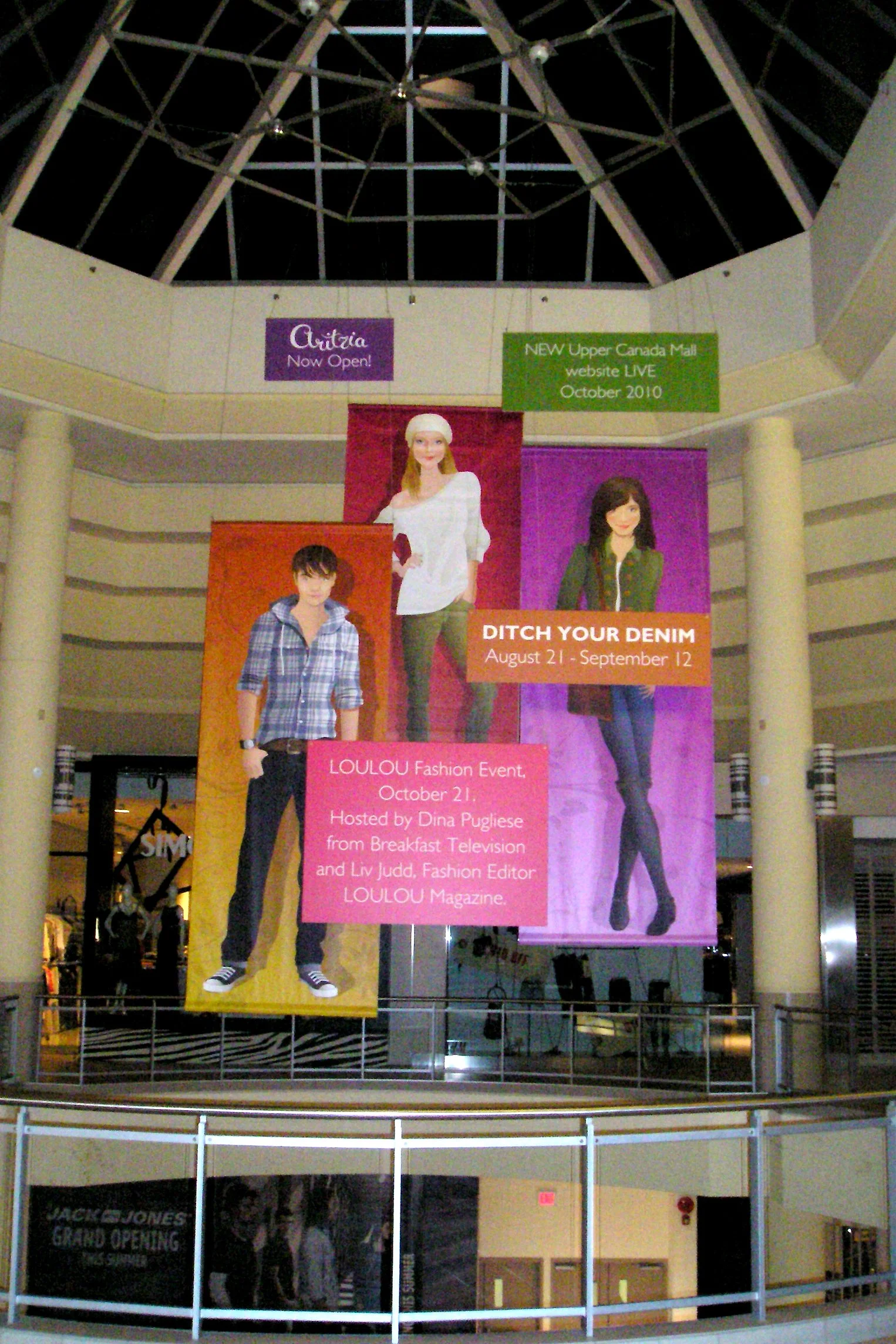 The Upper Canada Mall ceiling banners feature suspended fabric panels with large-scale printing, creating an overhead visual canopy that guides and engages shoppers across the mall. Project: Upper Canada Mall Ceiling Banners | Client: Upper Canada Mall | Design credit: Upper Canada Mall
