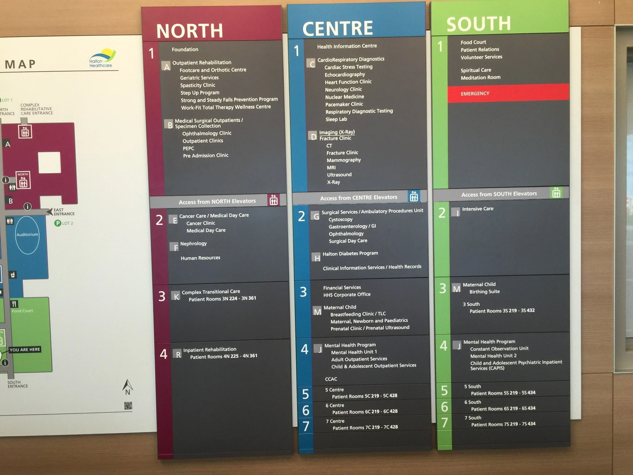 ~Colored hospital directory signs with sections labeled North, Centre, and South, listing various medical departments and services.