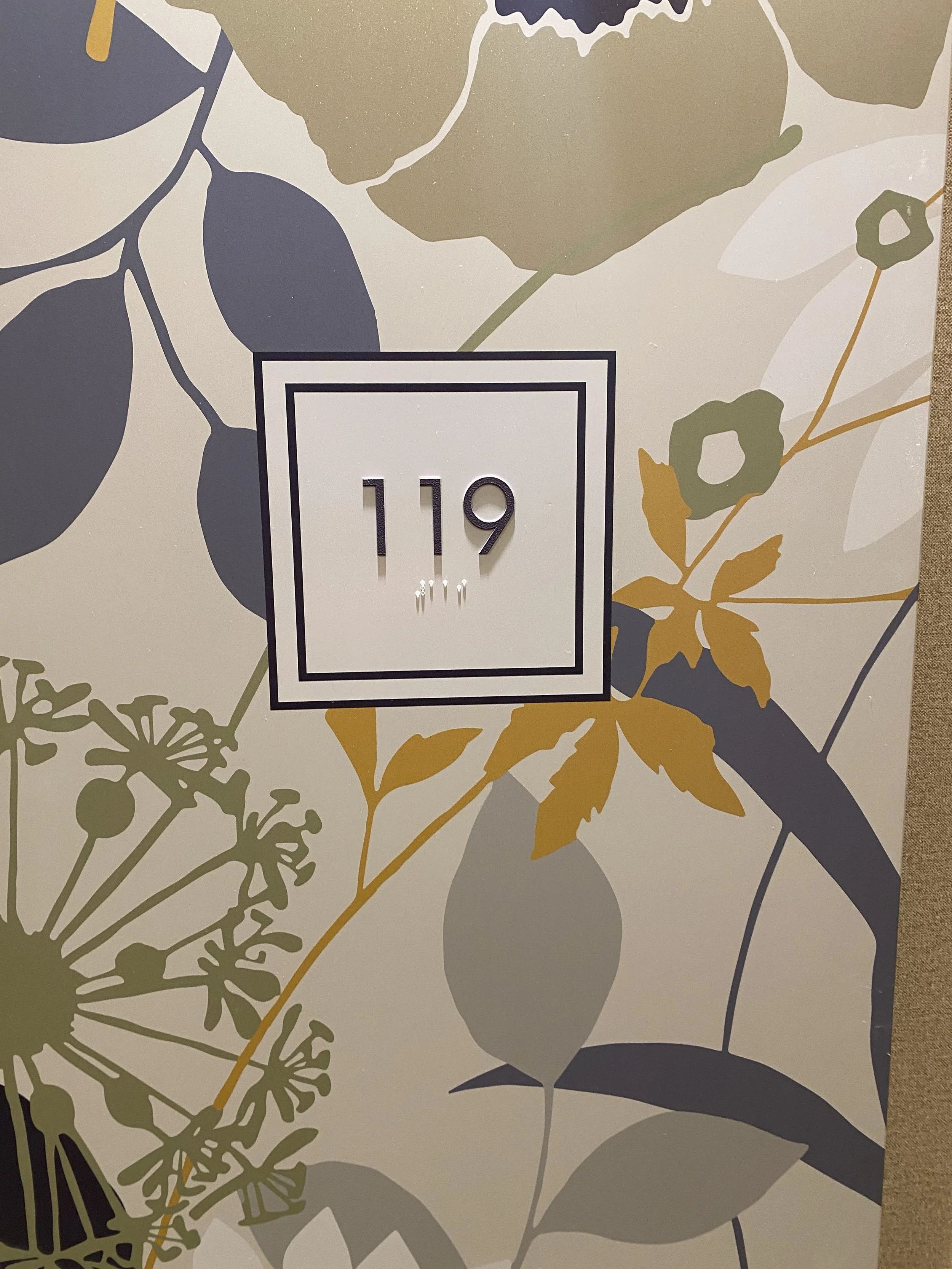 ~Decorative wall panel with floral pattern and a room number sign reading '115' near a door, illuminated by a spotlight.
