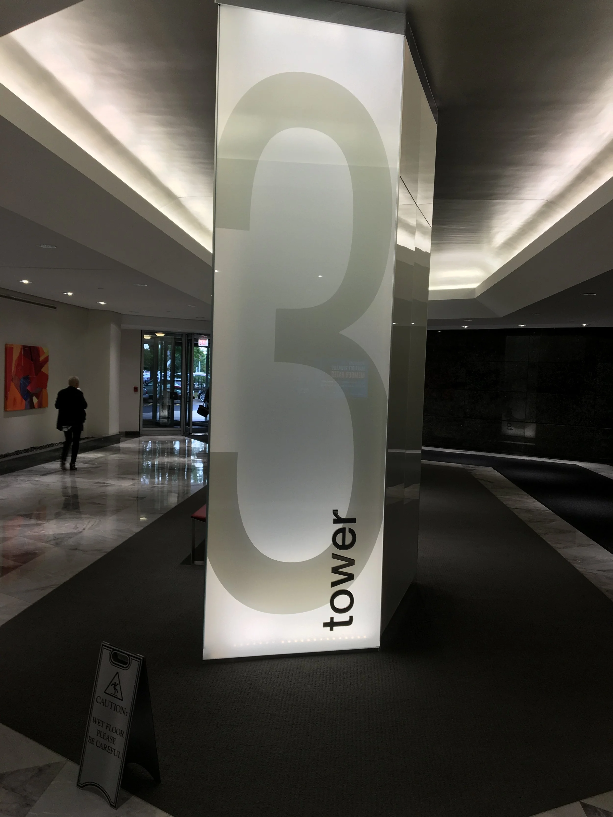 ~Large illuminated vertical sign with the word 'tower' and a stylized number '3' in the background, located inside a building lobby.