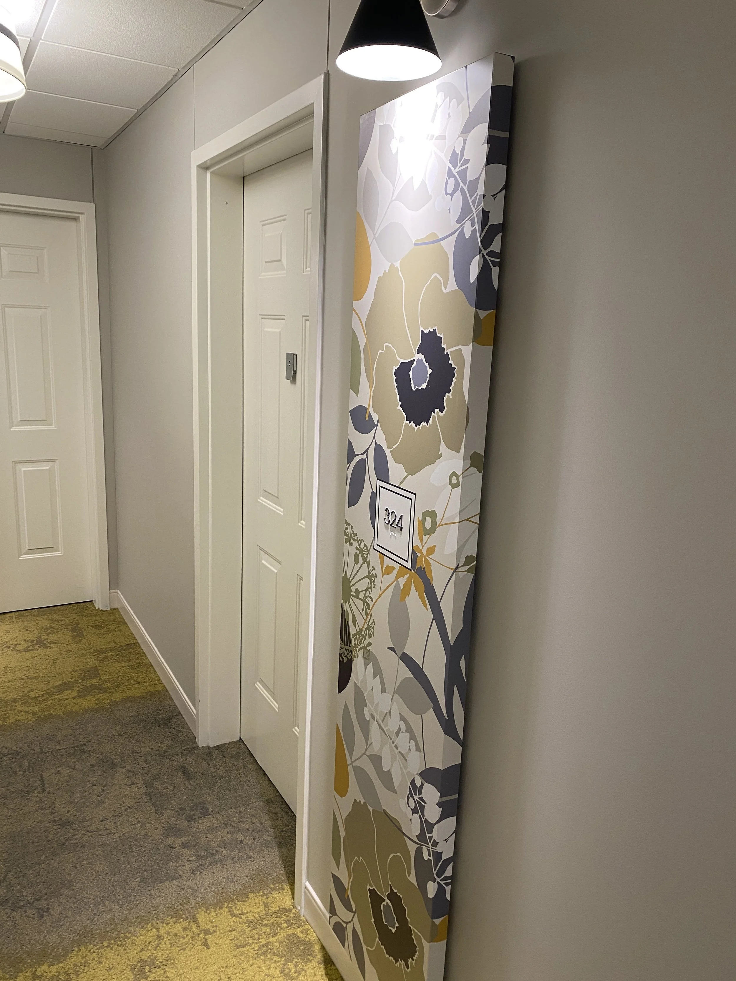 ~Hallway with two closed white doors, a floral-patterned cabinet with the number 324, and a black ceiling light fixture.